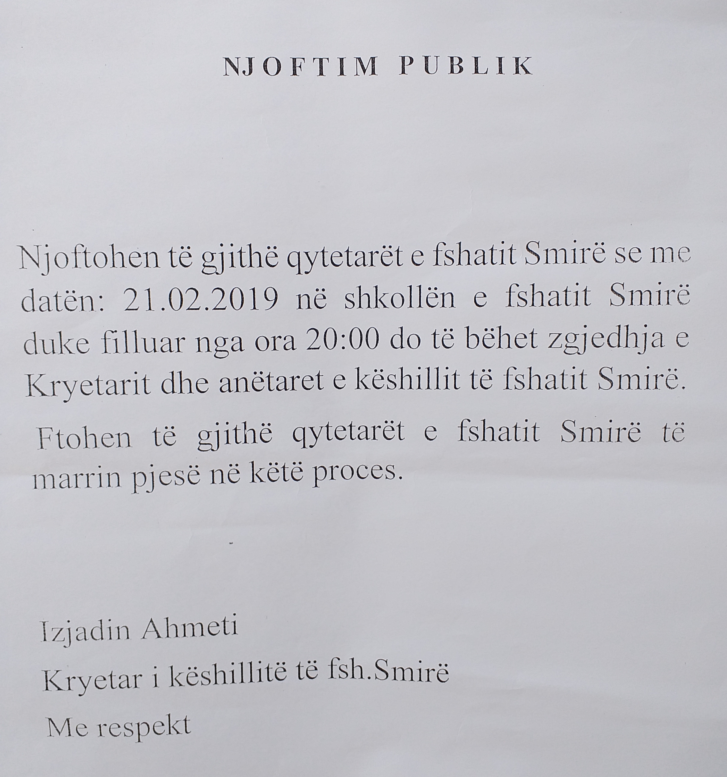Njoftohen të gjithë banorët e fshatit Smirë, se të enjten, më 21 shkurt 2019, do të zgjedhet kryetari dhe Këshilli i Fshatit. Takimi do të mbahet në lokalet e shkollës, nga ora 20:00. Ftoheni të merrni pjesë në këtë proces demokratik.