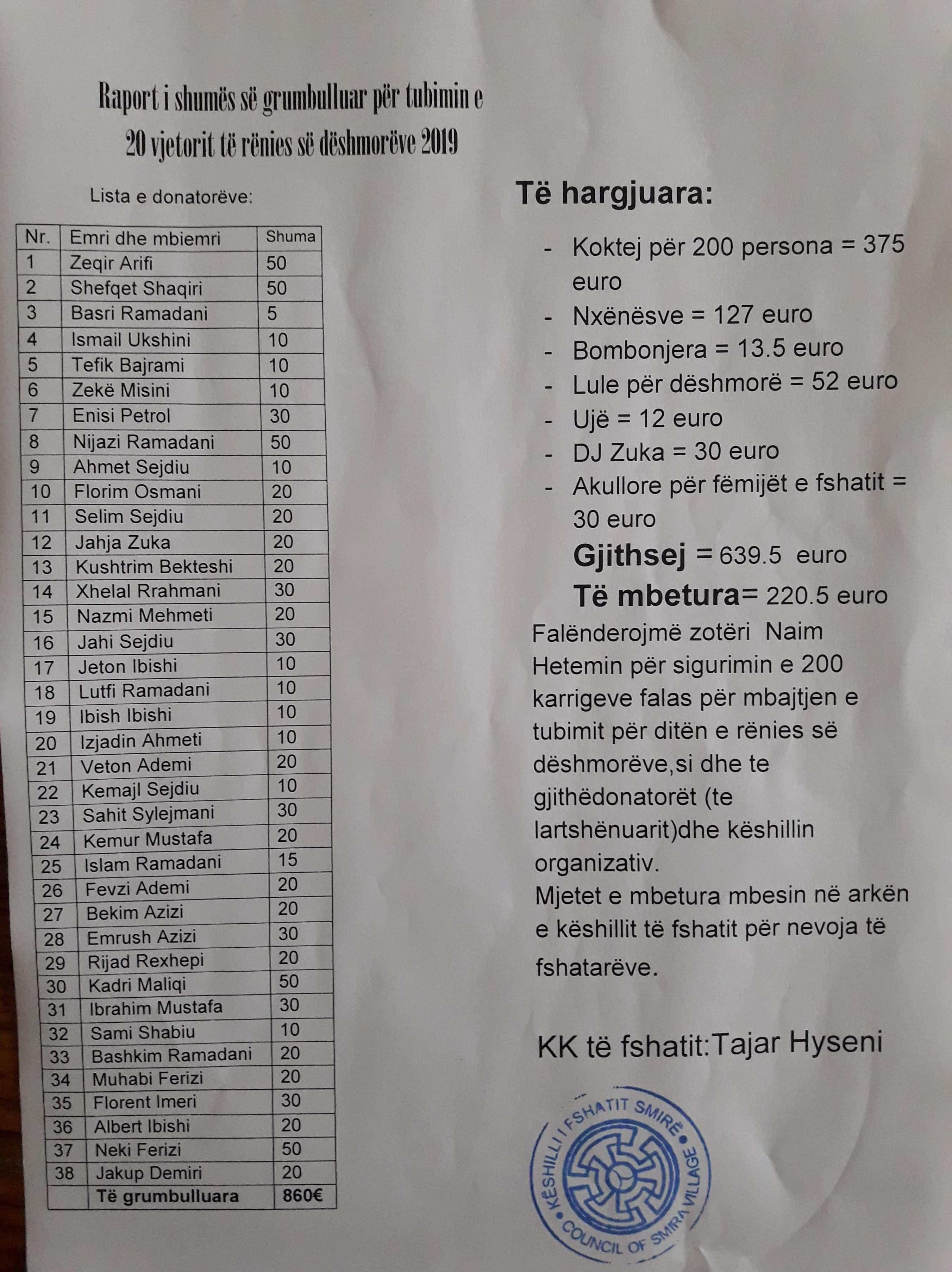 Kryetari i Këshillit të Fshatit Tajar Hyseni, ka bërë publike edhe raportin financiar të kësaj ngjarjeje.
