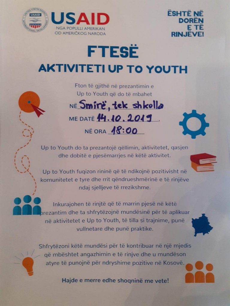 USAID fton të rinjtë në një sesion informues në Smirë ku do të prezantohen mundësitë për të aplikuar në aktivitetet e Up to Youth si: trajnime, punë vullnetare dhe punë praktike.