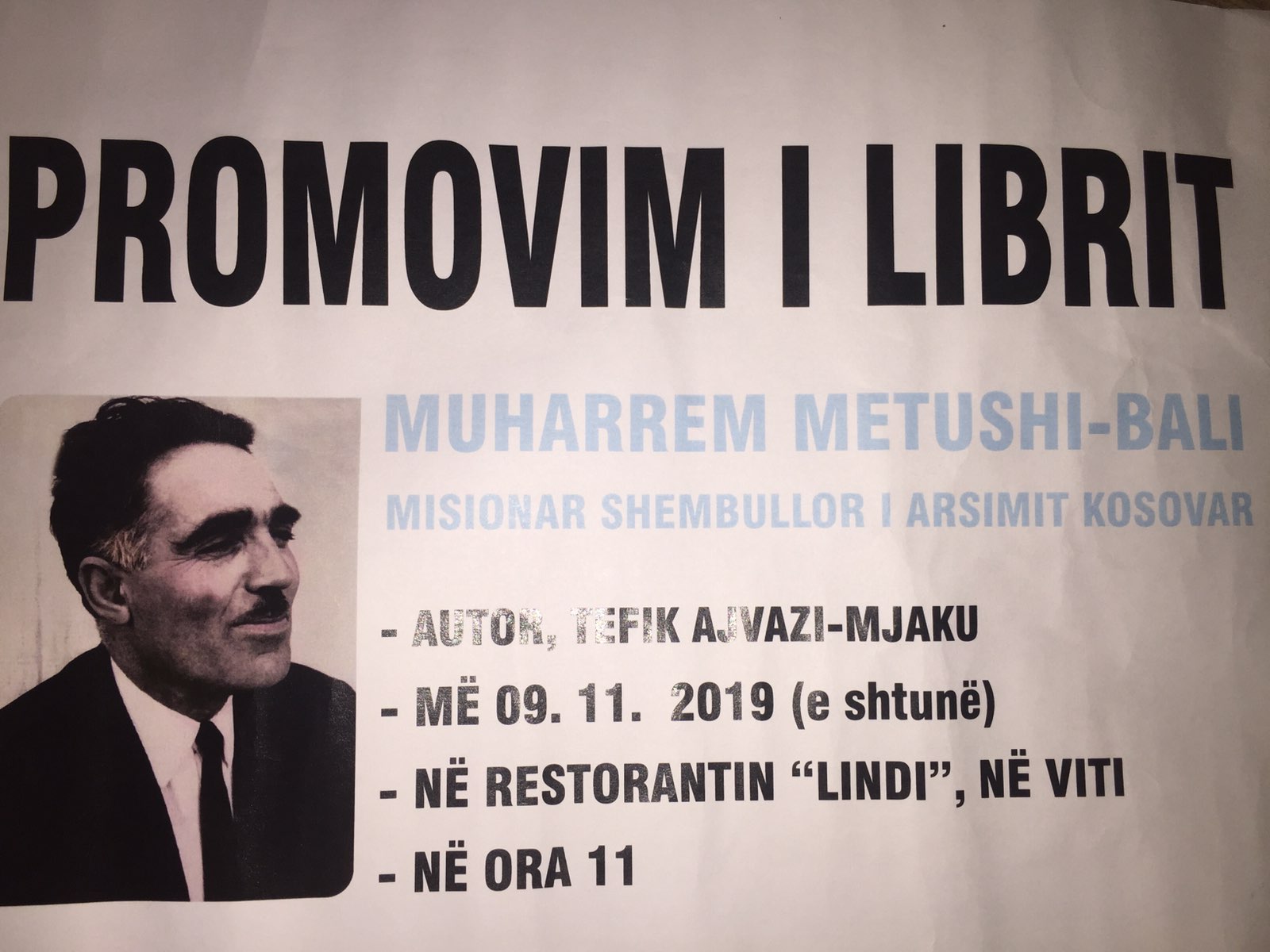 Së shpejti në duar të lexuesve do të jetë monografia “Muharrem Metushi-Bali, misionar shembullor i arsimit kosovar”, i autorit Tefik Ajvazi-Mjaku. Promovimi do të bëhet të shtunën, më 9 nëntor 2019, nga ora 11:00, në Restorant “Lindi”, në Viti.