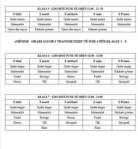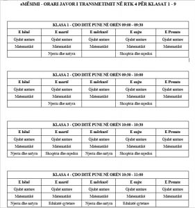 “Të dashur nxënës, prindër e mësimdhënës! Kam kënaqësinë t’ju njoftoj se nga e hëna (datë 06 prill 2020) përmbajtja e mësimit në distancë do të zgjerohet duke mbuluar shumicën e lëndëve mësimore për klasat 1-9. Transmetimi televiziv do të mbulohet nga Radio Televizioni i Kosovës, sipas kalendarit të bashkëlidhur, ndërsa të njëjtat materiale janë në dispozicion edhe në ueb faqen eMesimi”, thuhet ndër të tjera në njoftimin e miistres Hykmete Bajrami.